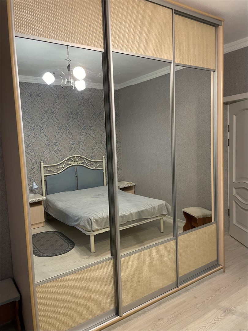 - Мебель: вешалка, диван раскладной, зеркало, кровать двуспальная, прикроватные тумбочки, стол обеденный, стулья, шкаф-купе